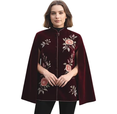 Velvet has always been the fabric of royalty. Its soft texture, lustrous finish, and rich appeal make it a favorite for winter fashion. When combined with hand embroidery or machine embroidery, the result is a designer cape jacket that feels both traditional and modern.